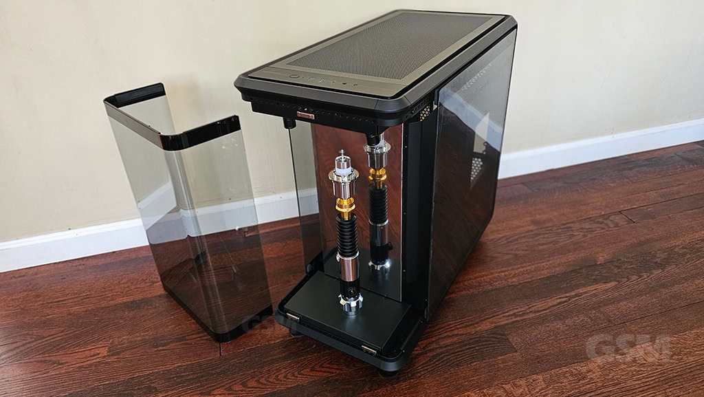 The Masterframe 360 Panorama has three panels of tempered glass, left, right and front. Since this is a presentational box it makes sense that this is only available in black although the version at Computex 2025 had grey accents. The left and right glass panels are square roughly but the front glass is a u shape. There’s also the top panel which is a non-glass aluminum panel. All of the exterior panels are magnetic just like on the Masterframe 600. This just makes things better. It would seem that these magnetic panels went from innovation to just being ‘the way’ from Cooler Master. We’re all about it.