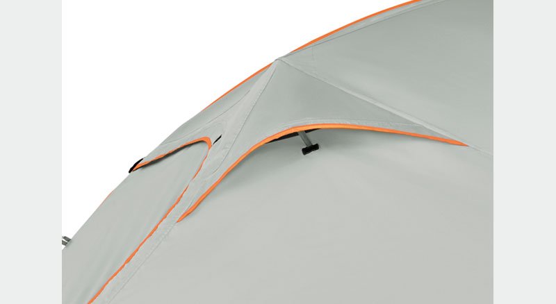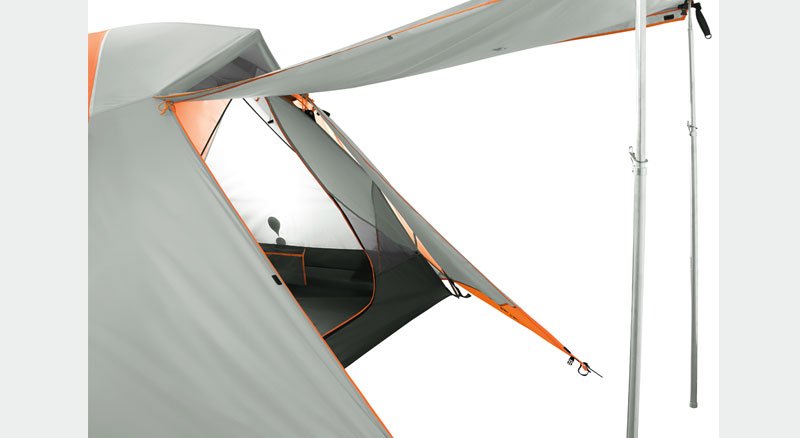 The Eureka V3 Enhanced Tent System, Volume, Venting, Versatility maximizes comfort and usage. A vertical strut vestibule pole creates extra volume for protected storage versatility while enhancing ventilation. Vectored fly-to-tent body pullouts increase stability and tent volume. Additional hooded fly vents and mesh panels increase airflow essential for keeping condensation from building up on the interior. The rear vestibule can be zipped and secured down or unzipped and raised up on poles for an open configuration.