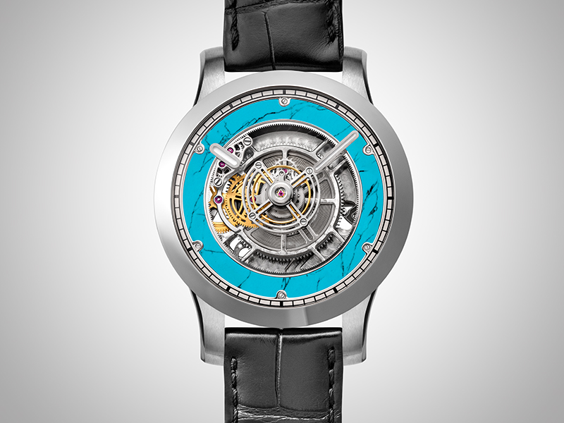 Driving the tourbillon is the exclusive KS 7’006 movement, manually wound, consisting of 220 precisely crafted components. Rhodium plated hands are filled with white Super-LumiNova.